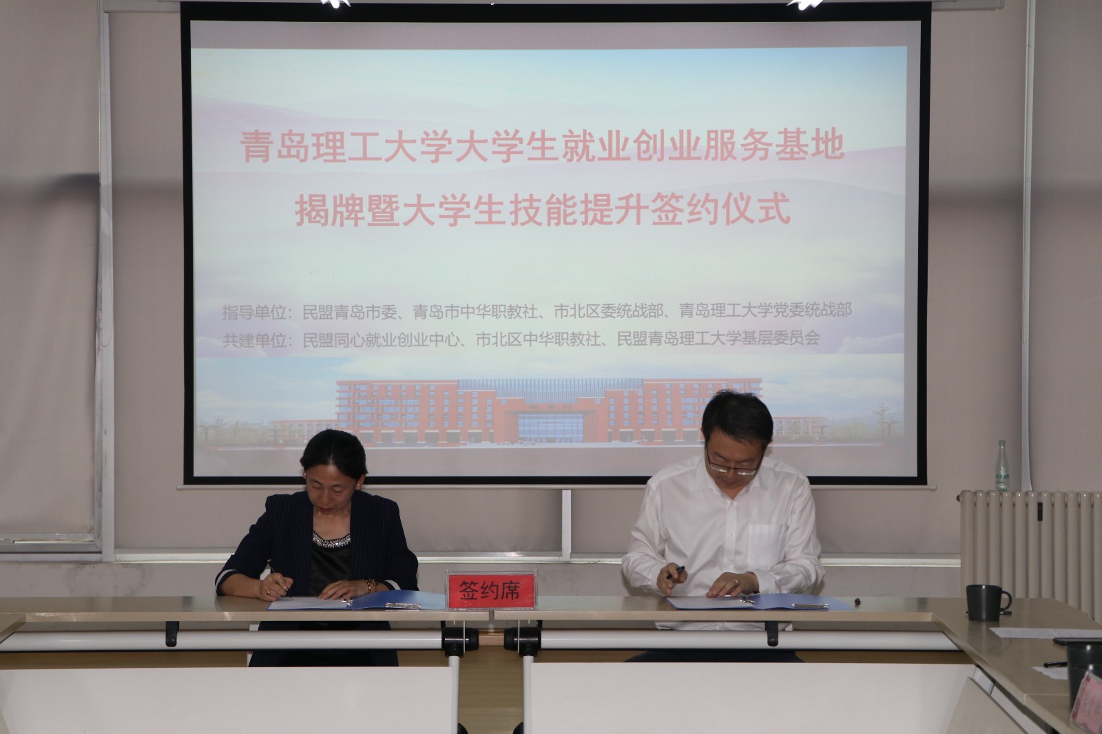 5月26日,“大学生就业创业服务基地”揭牌签约仪式在青岛理工大学举行。民盟青岛市委、青岛市中华职教社、市北区委统战部、理工大学党委统战部、民盟青岛理工大学委员会、青岛市北区中华职教社、同心就业创业中心等单位有关领导出席了活动。