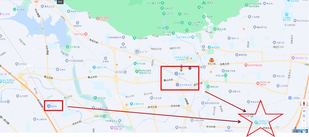 (三)高铁动车:高铁站-泰安站乘坐40路公交车至农大新校站下车;高铁站-泰安站打车30分钟到达;