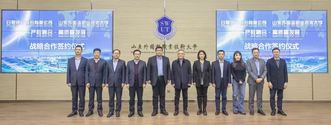 1月10日下午,山东外国语职业技术大学与日照银行股份有限公司举行“产教融合·高质量发展”战略合作签约仪式。日照银行党委书记、董事长杨宝峰,党委副书记、行长陈迎,党委副书记、监事长王雷,资深专员、人力资源部总经理安佰刚,日照银行高新支行行长宁志文,全国政协委员、山东华信工贸集团董事长、学校董事长拜文汇,校长杜琳、副校长杨宜丰出席仪式。