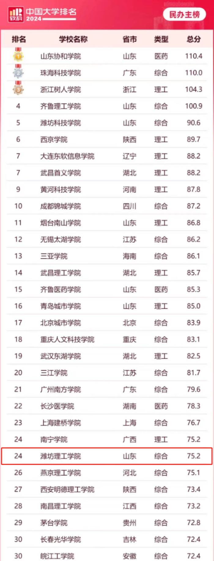 突破!潍坊理工学院在2024软科中国民办高校排名中位列第24位