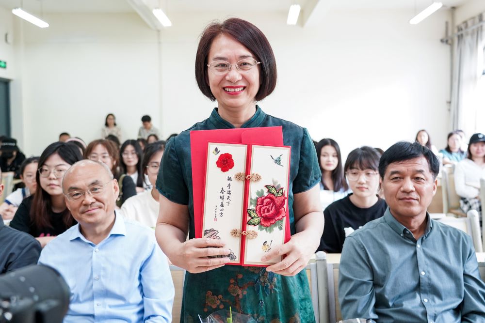 “一次慕名的选择,成为了师生缘分的开始。感谢您一直以来的教导与陪伴,我们会永远记住您站在讲台上,铿锵有力、闪闪发光的样子!得遇良师,三生有幸。在此,我仅代表全体同学衷心祝愿陈老师未来的生活幸福美满、万事顺意、笑容常在,也愿健康与才华伴您年年岁岁如今!”环工221班李栋作为学生代表向陈老师表达感谢,并代表全体同学向陈老师赠送精心准备的带有全班同学签名的全手工制作祝福贺卡,现场响起了热烈掌声。