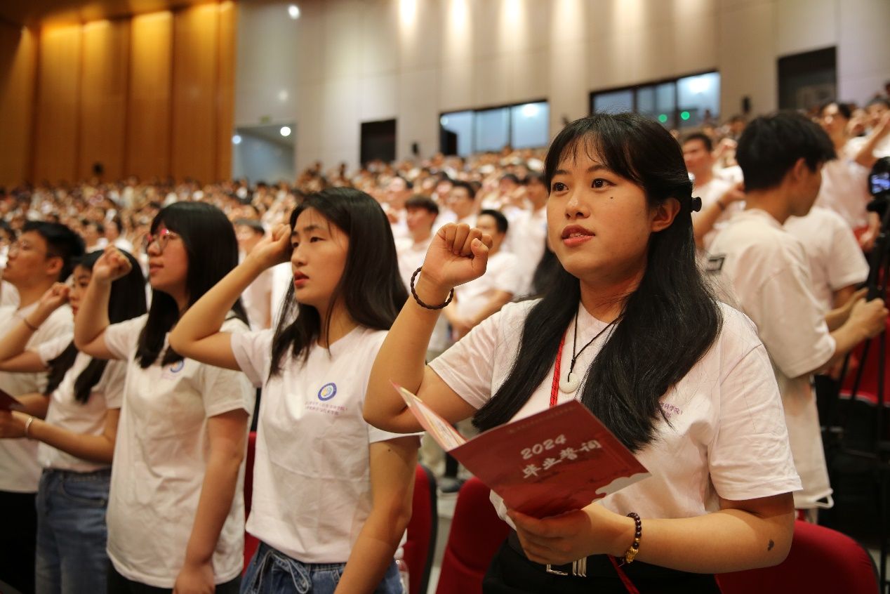 毕业生代表朗诵《此心归处是工大(科院)》,深情表达对母校的不舍和对新征程的憧憬。“谨记母校教诲,弘扬校(院)精神,心怀国之大者,矢志强国伟业……”响亮的誓言声回荡在礼堂上空,2024届毕业生用最嘹亮的口号庄严宣誓。他们将带着仰望星空的勇气和脚踏实地的底气奔赴心之所向,奋力书写为中国式现代化挺膺担当的青春篇章。