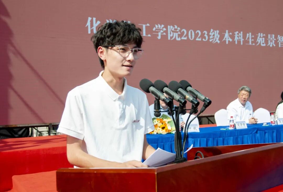 在校生代表、化学化工学院2023级学生苑景智分享在八角湾校区的成长心得,并从“坚定理想信念”“深耕专业学习”“锤炼综合素养”三个维度,为新生送上大学成长建议。