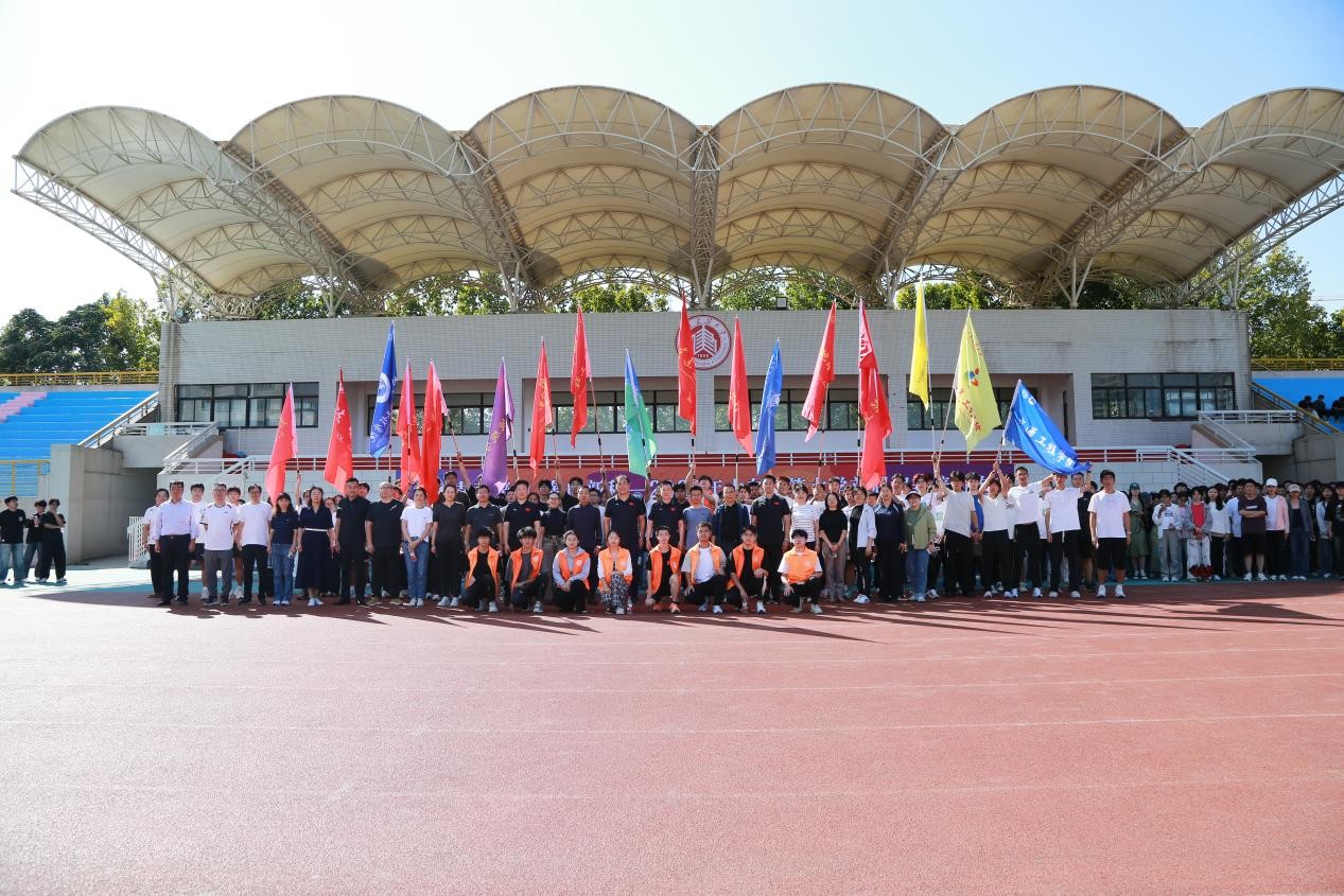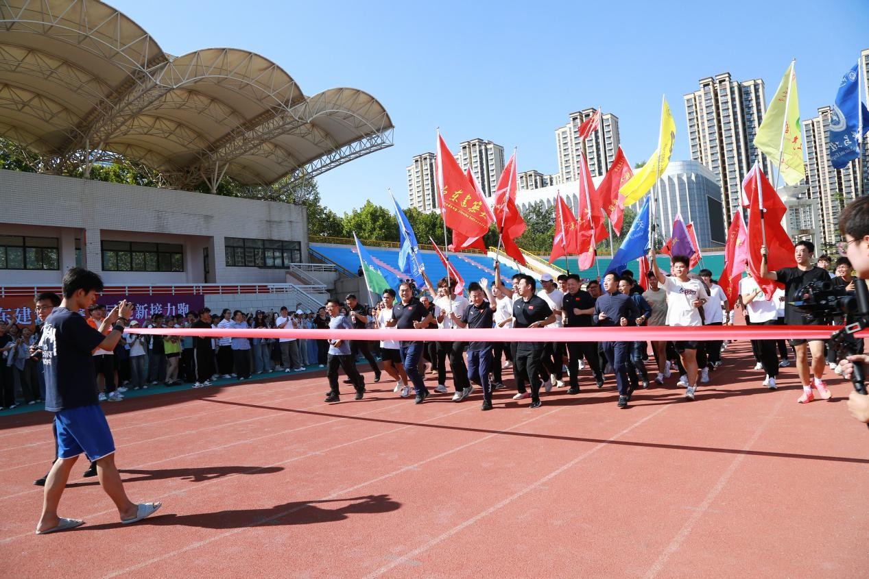 活动现场,黄晓广为接力跑鸣枪发令。17个学院各派出一支70名新生组成的代表队依次登场完成接力活动,黄晓广手持校旗带领各学院旗手及参加活动的教职工跑完最后一棒。飘扬的校旗与紧随其后的院旗,象征着学校与各学院同心聚力、共赴新程的奋进姿态。