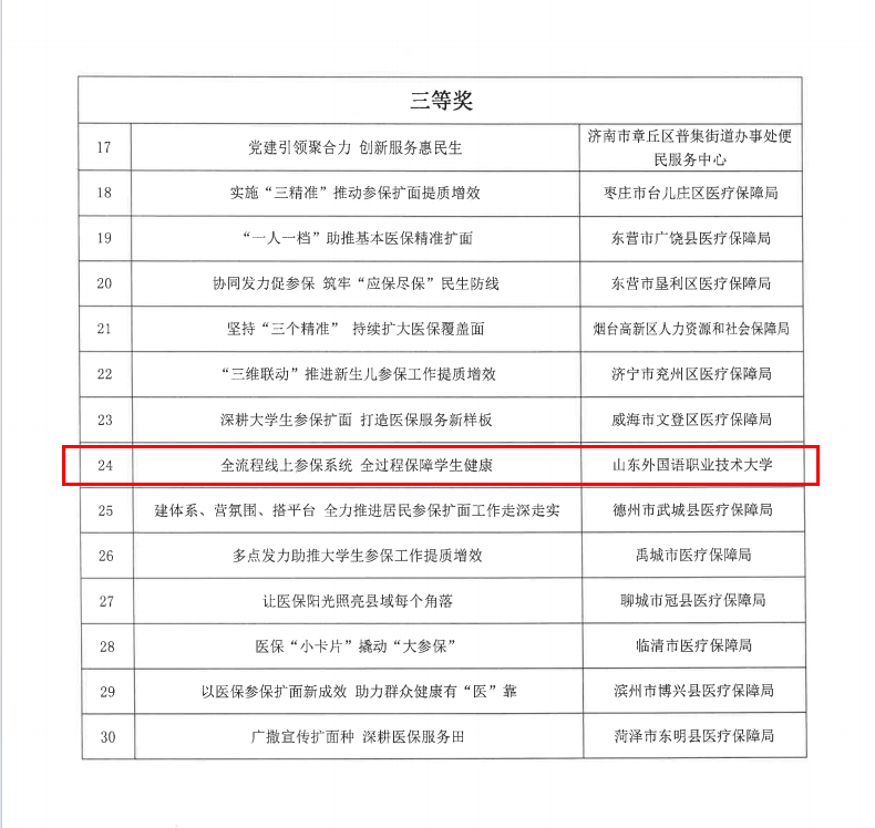 近日,山东外国语职业技术大学申报的案例《全流程线上参保系统 全过程保障学生健康》,在山东省医疗保障局组织开展的全省基本医保参保扩面创新实践案例评选中荣获三等奖,也是该活动中唯一获奖的高校。