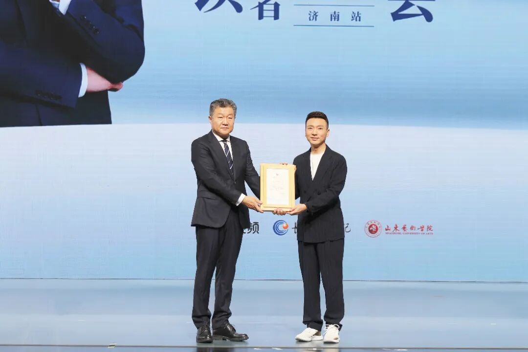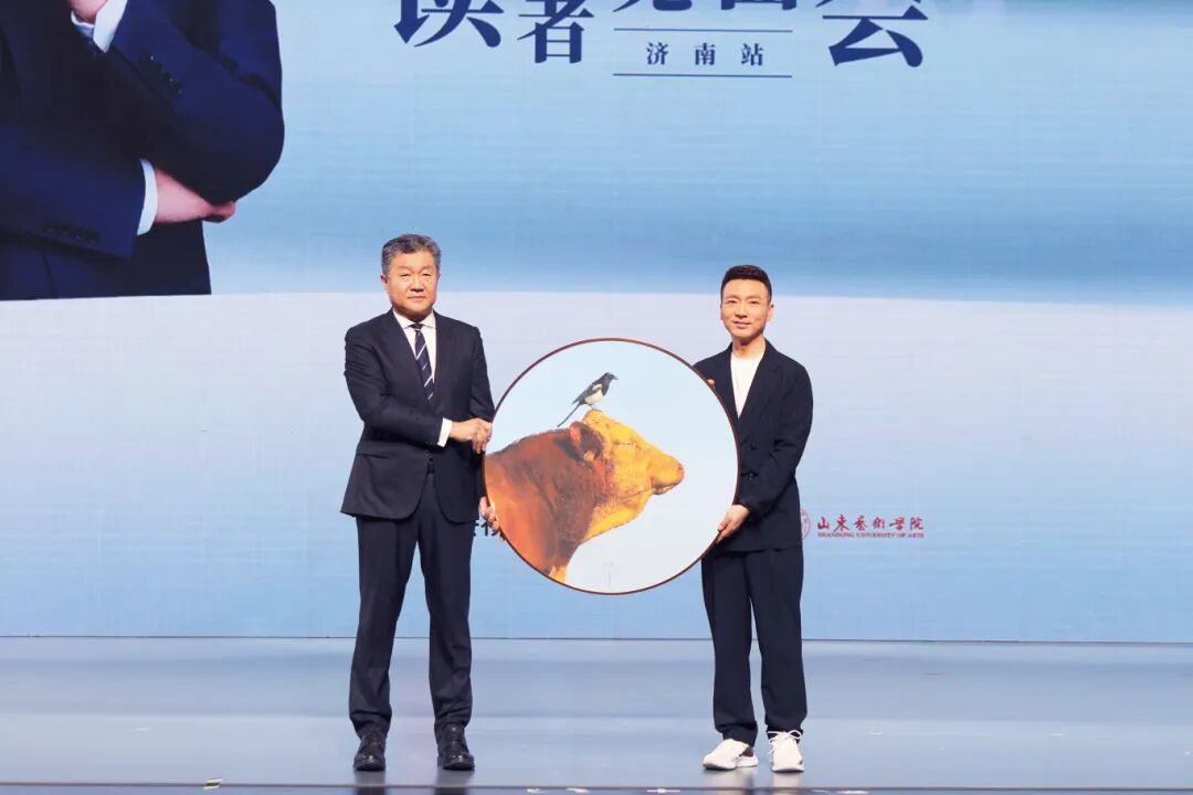 康辉向山东艺术学院捐赠了300本个人著作《康辉咬文嚼字》,徐青峰代表学校接受捐赠,并向康辉回赠了版画作品《抬头见喜》。