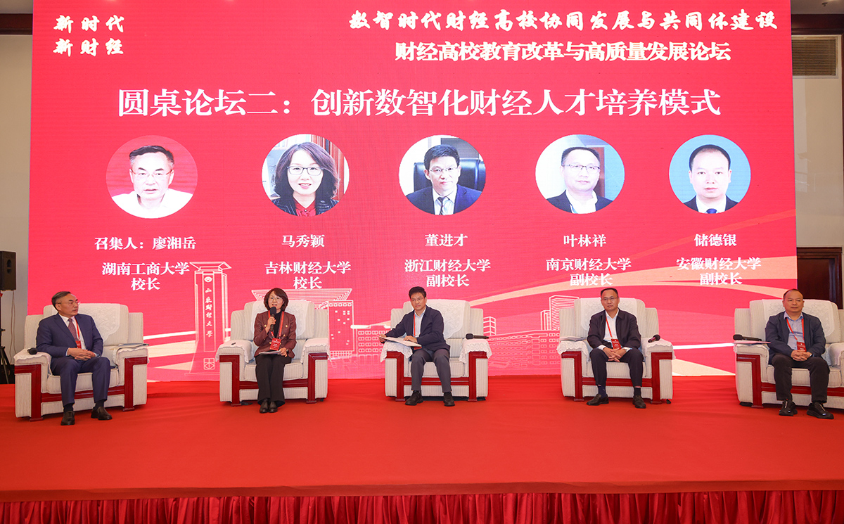 圆桌论坛环节由“数智时代新财经建设改革实践”和“创新数智化财经人才培养模式”两个专题组成。第一专题由对外经济贸易大学副校长陈德球任召集人,西安财经大学校长赵敏娟、首都经济贸易大学副校长尹志超、东北财经大学副校长施锦芳、河北经贸大学副校长杨金田探讨了“新财经”改革的蓝图。第二专题由湖南工商大学校长廖湘岳任召集人,吉林财经大学校长马秀颖、浙江财经大学副校长董进才、南京财经大学副校长叶林祥、安徽财经大学副校长储德银探讨了如何把蓝图转化为可落地、可量化、可迭代的育人实践。