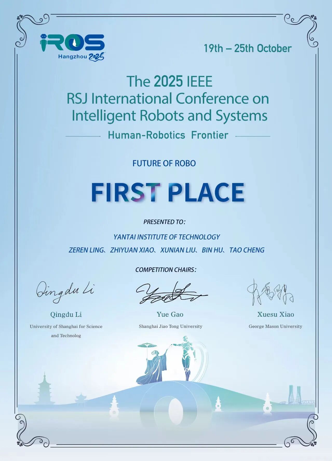近日,2025年IROS&Future of Robo 国际机器人竞赛圆满落幕,烟台理工学院人工智能学院 “中科非凡” 队凭借硬核技术实力力挫全球精英团队,斩获世界冠军(一等奖)。这是烟台理工学院人工智能学院时隔四年后再次登顶该项赛事,成功在全球科创舞台上续写辉煌篇章。