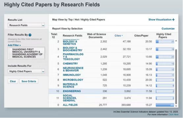 山东第一医科大学“工程学”学科首次进入ESI全球排名前1%