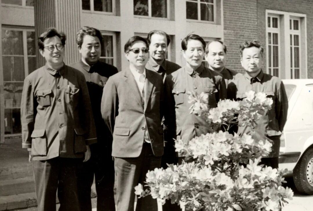 1985年5月6日,烟台大学首届领导班子与烟台大学校务委员会主任、时任烟台市委书记王济夫合影。左起:邱殿辅、杨春洗、王济夫、杜建寰、沈克琦、王义端、钱振为