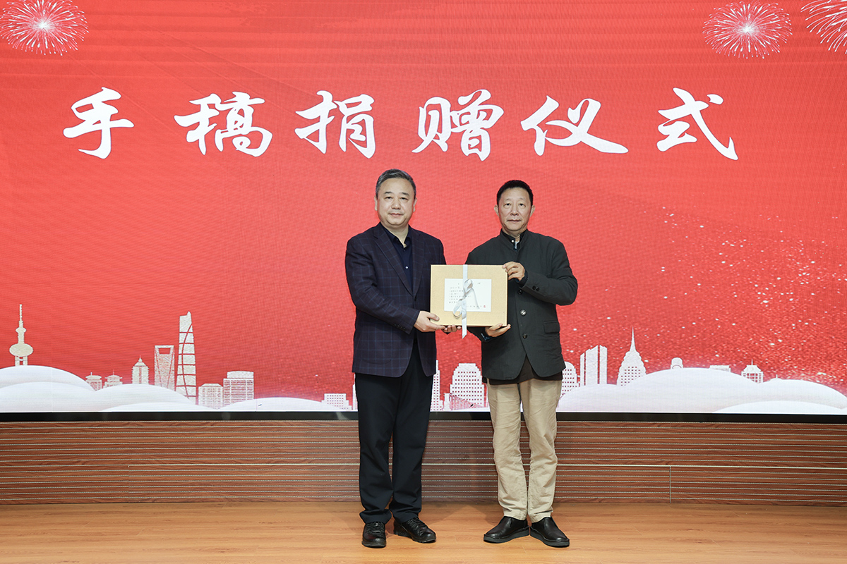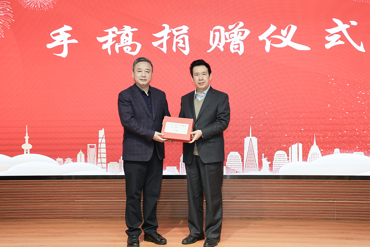 张炜先生向山东财经大学赠送长诗《爱琴海日落》《在路上》手稿;著名诗人,诗学、音乐及文化批评家,书法家,北京师范大学特聘教授、博士生导师,欧阳江河先生向山东财经大学赠送诗歌《寂静》《星期日的钥匙》《纸上的秋天》《核按钮》手稿。