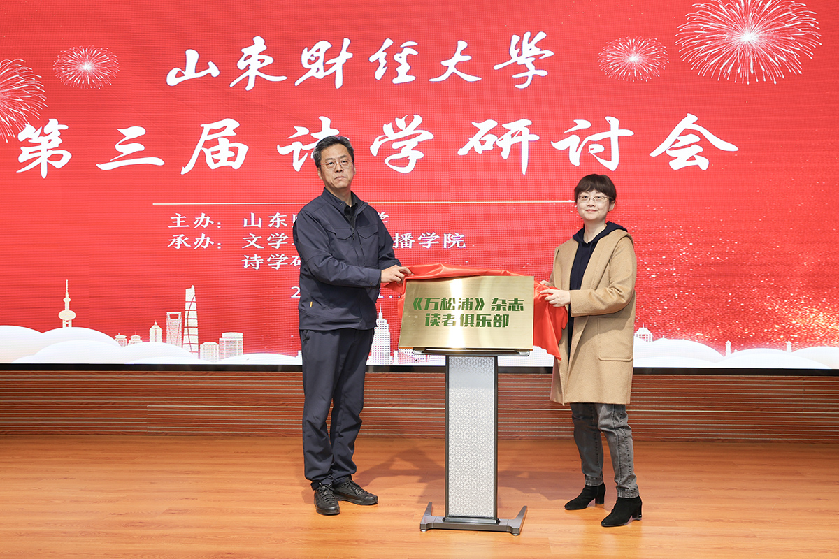 文学与新闻传播学院党委书记、诗学研究中心常务副主任杜啸尘汇报了诗学研究中心一年来的工作情况。山东文艺出版社社长、《万松浦》杂志主编徐迪南同志,山东财经大学文学与新闻传播学院院长张超同志为“《万松浦》杂志读者俱乐部”揭牌。