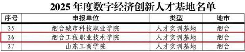 近日,山东省工业和信息化厅公布了2025年度山东省数字经济创新平台名单,烟台工程职业技术学院申报的“数字经济创新人才基地”成功入选。