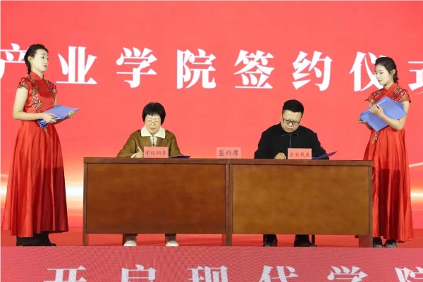 董事长、校长刘春静与山东开创集团股份有限公司、山东明仁福瑞达制药股份有限公司、漱玉平民大药房连锁股份有限公司、麦迪格眼科医院、山东秦老太食品有限公司、山东高盛物联科技集团有限公司代表签订了产业学院合作协议书。
