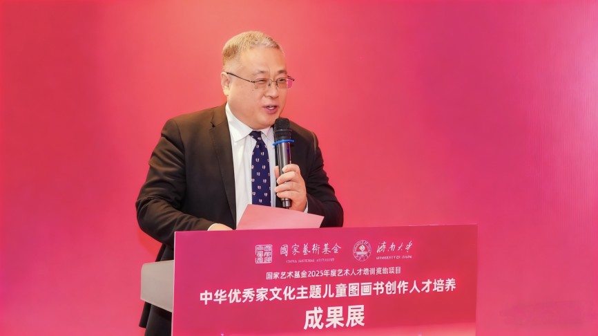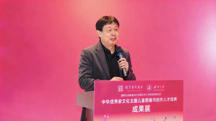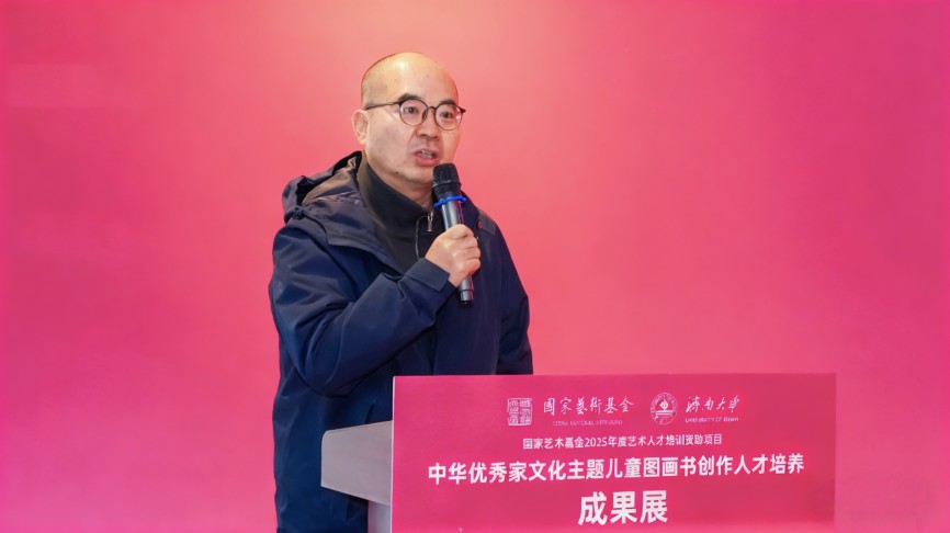 2025年11月22日上午,国家艺术基金2025年度艺术人才培训资助项目——《中华优秀家文化主题儿童图画书创作人才培养》结业展开幕式在济南大学舜道艺术馆隆重举行。山东工艺美术学院、山东艺术学院、山东建筑大学、齐鲁师范学院、山东劳动职业技术学院、明天出版社、济南大学领导以及美术界和教育界专家、项目导师和学员代表、媒体代表共同出席,开幕式由济南大学美术与设计学院党委书记陈春锋主持。