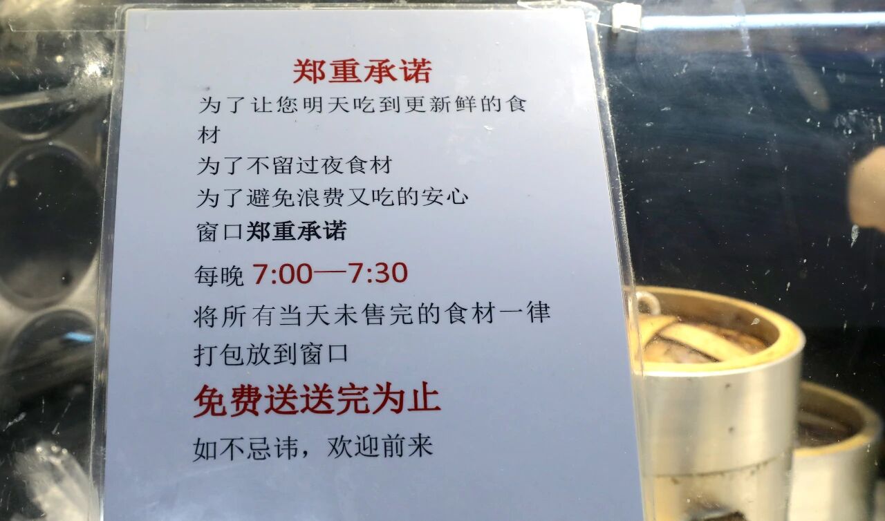临沂大学第二餐厅,经营南京小笼包的店主鞠雪梅夫妇贴出一张特别告示:“为避免浪费,又吃得安心,每晚闭店后,所有当天未售完的食材一律打包放到窗口,免费送。”