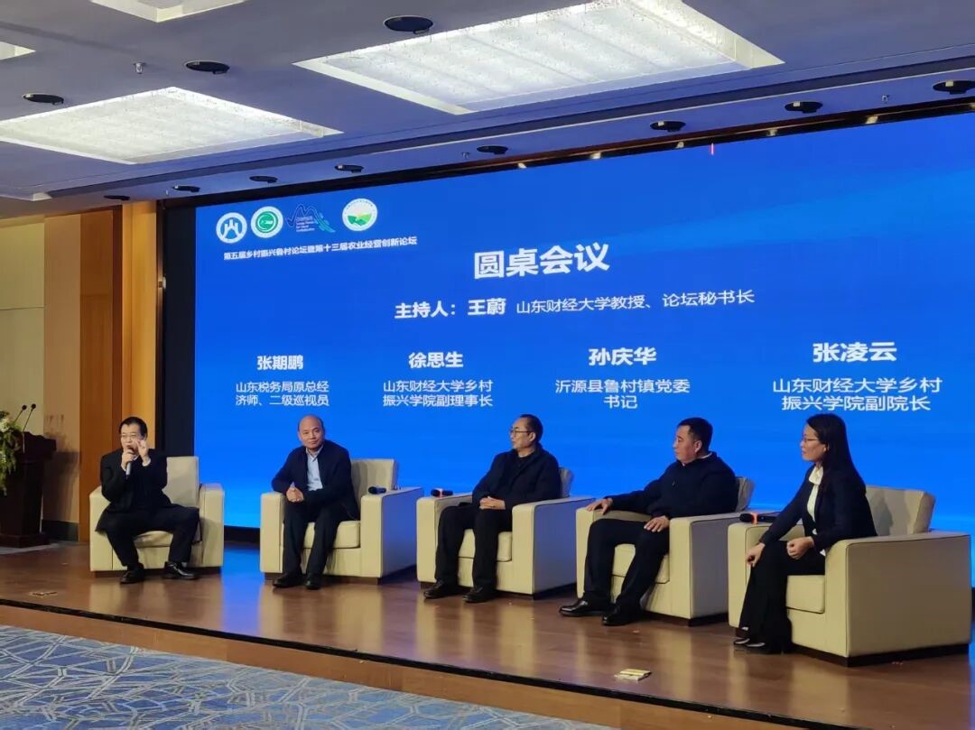 山东税务局二级巡视员张期鹏,乡村振兴学院副理事长徐思生,乡村振兴学院副院长张凌云,鲁村镇党委书记孙庆华,沂源县乡村振兴服务中心主任张德娟参加圆桌论坛并作交流。