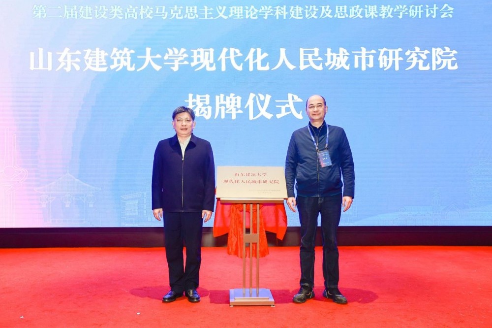 在揭牌仪式环节,黄志良与杨景波共同为“建设类高校马克思主义学院实践教学基地”揭牌;中国辩证唯物主义研究会城市哲学研究分会会长庄友刚与杨景波为“山东建筑大学现代化人民城市研究院”揭牌。此次签约合作及两大平台的成立,将推动马克思主义理论与建筑实践深度融合,为中国式现代化城市高质量发展注入智力支撑。