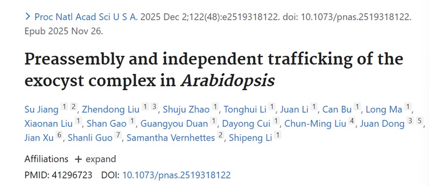 2025年11月26日,齐鲁师范学院生命科学学院李师鹏教授团队在国际知名期刊《美国科学院院刊》(PNAS)上发表了题为《Preassembly and independent trafficking of the exocyst complex in Arabidopsis》的研究论文。这一成果聚焦植物细胞囊泡运输领域开展研究,开辟了新的研究方向。