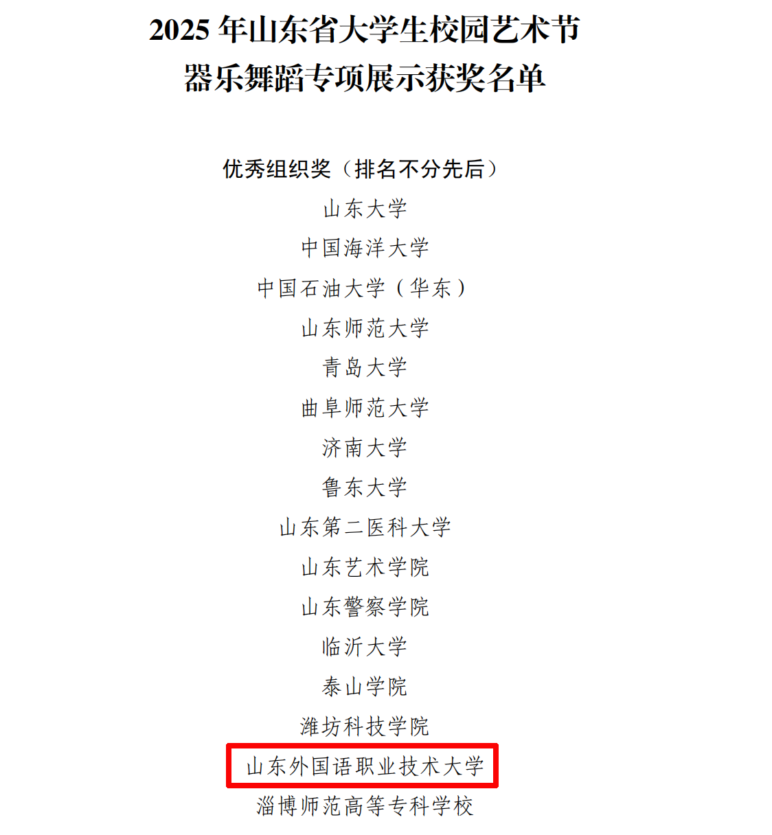 近日,省教育厅公布2025年山东省大学生校园艺术节器乐舞蹈专项展示活动获奖情况,山东外国语职业技术大学选送的4部作品全部获奖。其中,《秋日》《淡妆浓抹总相宜》获舞蹈甲组一等奖,器乐作品《天山之歌》获甲组二等奖,《唱支山歌给党听》获甲组三等奖,学校荣获“优秀组织奖”。