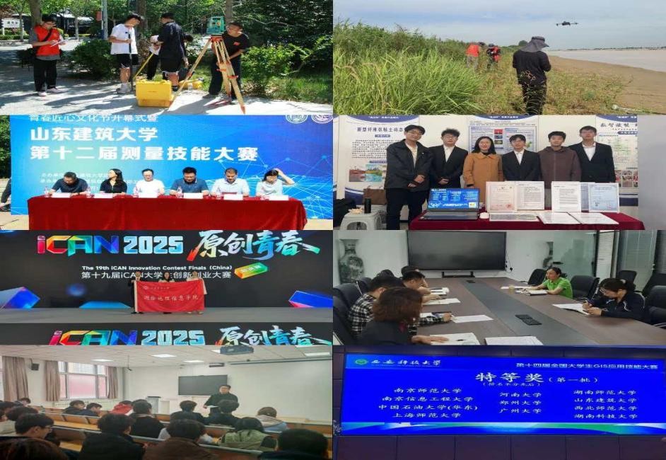 乐学聚焦能力淬炼,构建国家 - 省 - 校 - 院四级科创竞赛体系。完善学院科创培育体系和科创联盟组建师生团队,开设智绘科创训练营,常态化开展技术攻坚、优质项目培育等。2025 年学院 80% 以上的学生参与科创,斩获省级以上奖励 79 项,其中国家级 30 余项。获2025年学生在全国测绘学科创新创业智能大赛获特等奖4项、一等奖3项等优异成绩,获全国大学生 GIS 应用技能大赛特等奖等。测绘协会、GIS协会、遥感协会三个专业社团为新生定制技能培训,组建的“智测山河,绘护绿洲”实践团队入选省级重点实践团队,赴黄河三角洲专业实践团队获团中央专项立项,形成学中乐、乐中学良性循环。