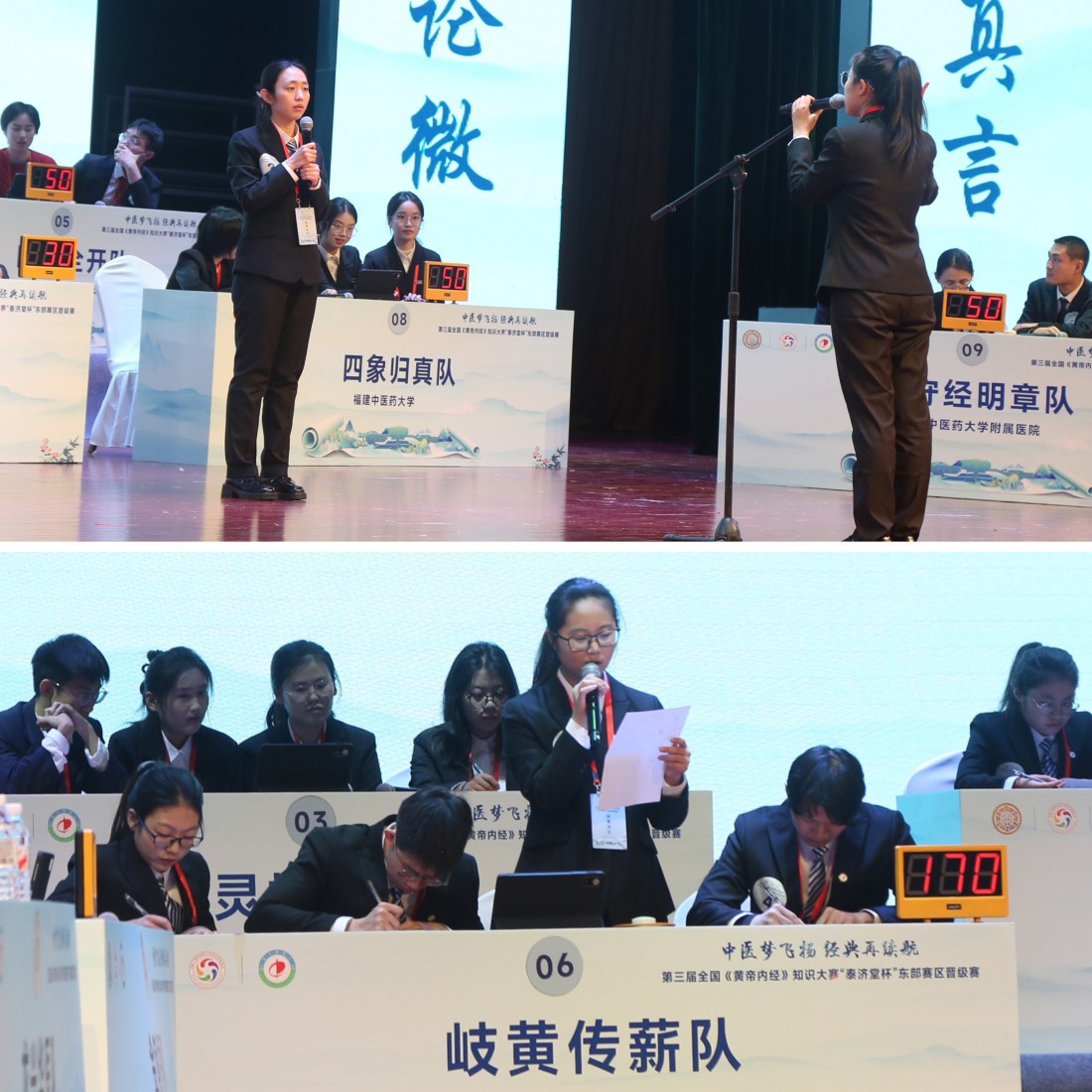 本次赛事汇聚江苏、上海、浙江、安徽、福建、山东6省(市)28支高校及医疗机构队伍、百余位选手同台竞技。比赛以多版《内经选读》《内经讲义》为核心,围绕经典条文、理论阐释与临床应用设题,通过预赛、决赛两大环节考察选手综合能力。预赛中,选手们在单选、多选、填空类必答题环节稳扎稳打;决赛环节,必答题限时作答精准高效,抢答题角逐激烈,猜词题展现团队默契,综合论述题条理清晰阐释医理,风险题环节选手果敢作答,充分彰显了东部赛区中医药学子扎实的经典积累与良好风貌。