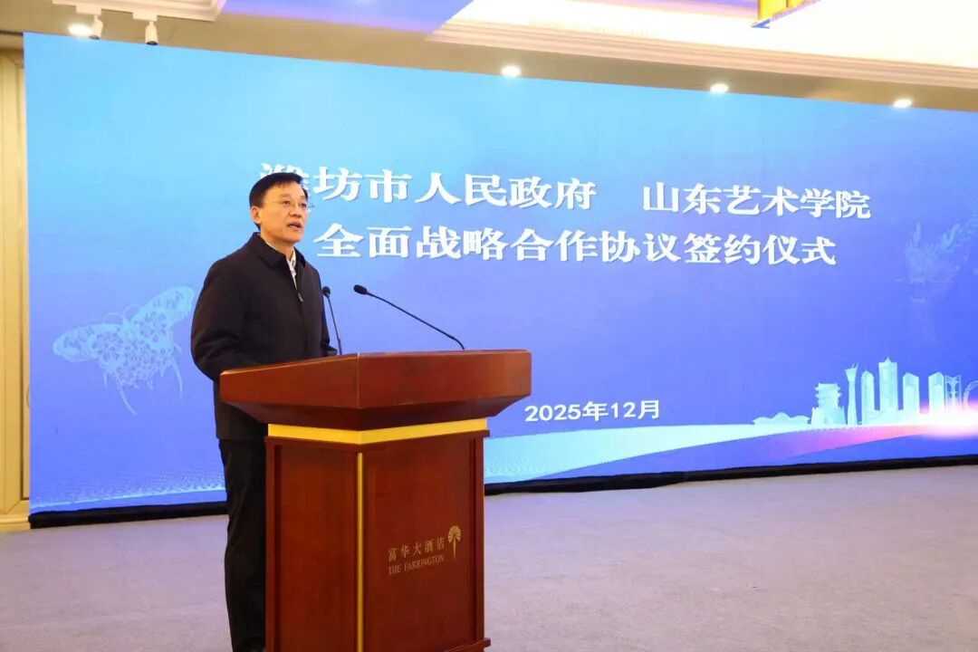 12月27日上午,潍坊市人民政府与山东艺术学院全面战略合作协议签约仪式举行。山东艺术学院党委书记徐梅、潍坊市委书记刘运致辞,潍坊学院党委书记来逢波出席。山东艺术学院党委委员、副院长韩文涛,潍坊市领导狄波代表双方签约。