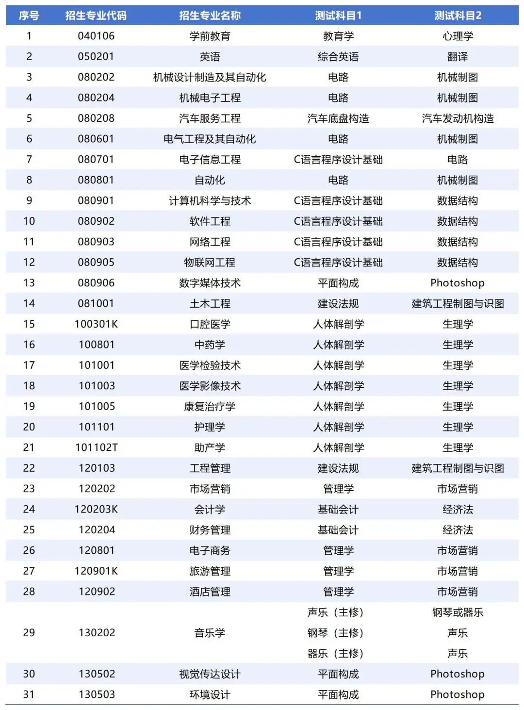 考生需参加所报考专业2个科目的测试,总时长120分钟,两科连考,中间不间断。具体测试科目如下: