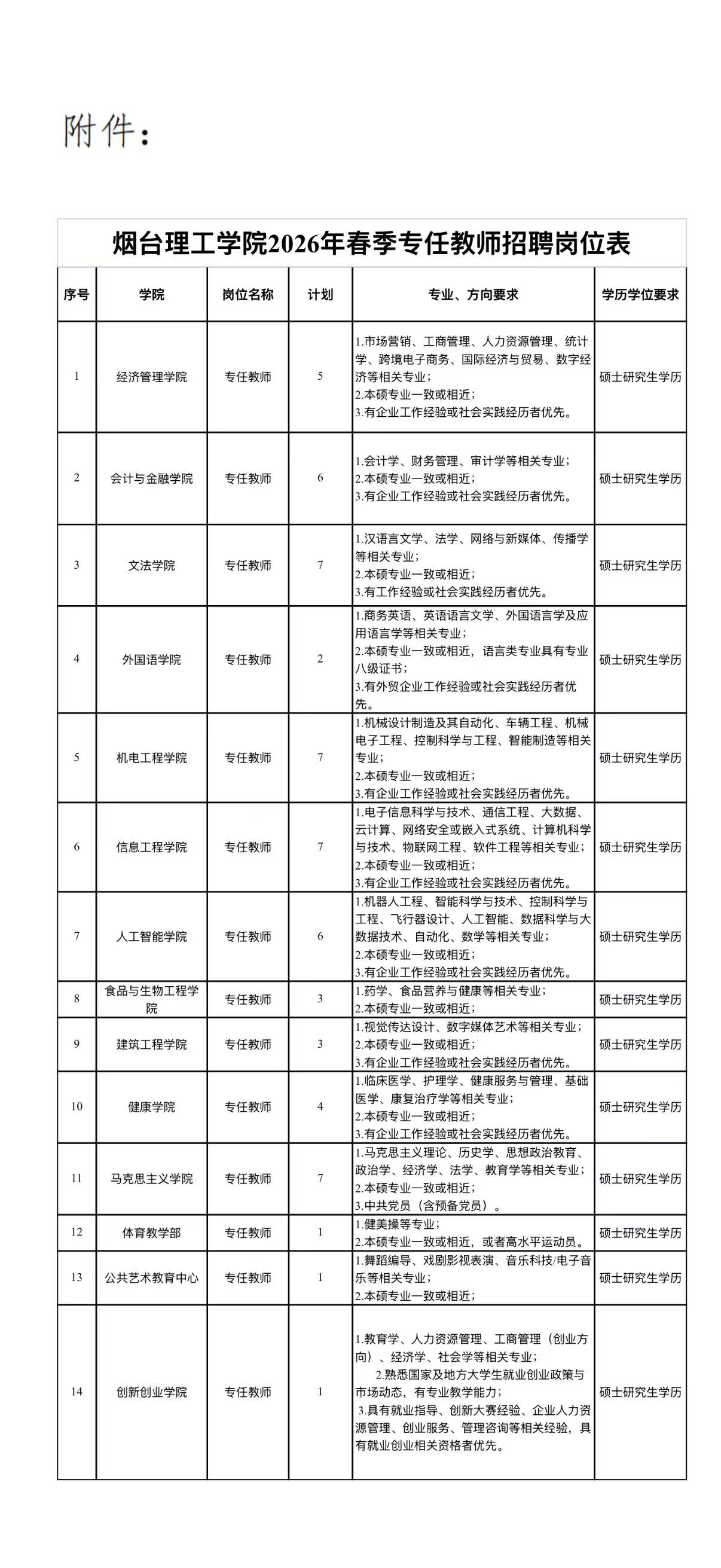 青年硕士专任教师60名。具体招聘岗位及要求详见附件《烟台理工学院2026年春季专任教师招聘岗位表》。