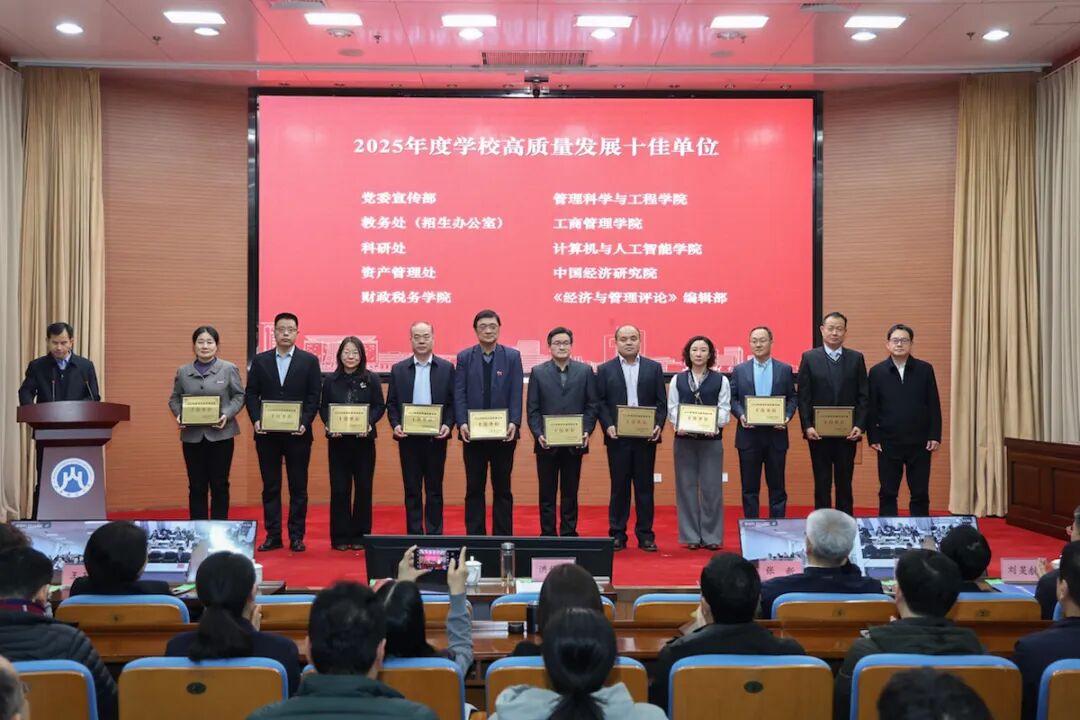在热烈的掌声中,洪俊杰为十佳单位颁奖。党委宣传部、教务处(招生办公室)、科研处、资产管理处、财政税务学院、管理科学与工程学院、工商管理学院、计算机与人工智能学院、中国经济研究院、《经济与管理评论》编辑部代表上台领奖。
