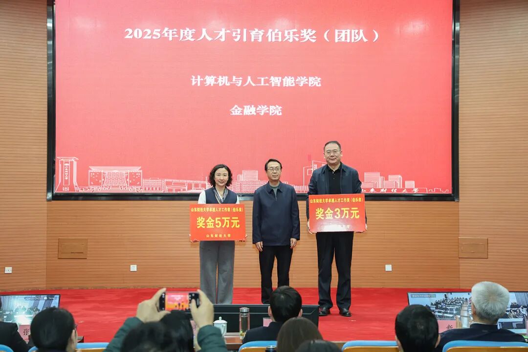 纪委书记、监察专员王玉花为计算机与人工智能学院常晓军、工商管理学院耿新、保险学院张鹏成颁发人才引育伯乐奖。