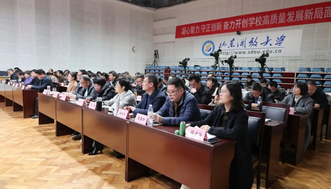 司家军在会上全面总结学校2025年工作,并对 2026年工作进行系统部署。他指出,2025年是“十四五”规划收官之年,也是学校全面深化综合改革、擘画“十五五”发展蓝图的关键之年。在省委、省政府的坚强领导下,在省委教育工委、省教育厅的关心指导下,学校坚持以习近平新时代中国特色社会主义思想为指导,深入学习贯彻党的二十大和二十届历次全会精神,全面贯彻落实习近平总书记关于教育的重要论述和视察山东重要讲话精神,落实立德树人根本任务,锚定新时代现代化一流开放大学建设目标,持续深化内涵建设,在党的建设、人才培养、社会服务和校园建设等方面取得了显著成效,为促进全民终身学习的学习型社会建设作出积极贡献。