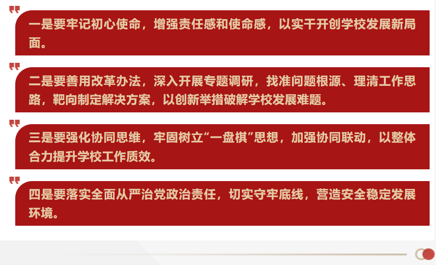 王瑛就抓好本次会议精神贯彻落实提出要求:一是提高政治站位,强化思想引领。要以高度的政治责任感、历史使命感和工作紧迫感,锚定目标、勇担使命,确保各项部署落地见效。二是聚焦重点任务,狠抓贯彻落实。要坚持目标导向、问题导向、结果导向相统一,围绕工作目标,压实责任,攻坚克难,推动学校事业发展不断取得新突破。三是锤炼过硬作风,提升执行效能。要强化团结协作,以更加饱满的精神状态、更加务实的工作举措、更加过硬的工作作风,奋力开创学校高质量发展新局面。