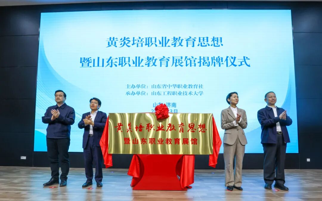 邓云锋,段青英,济南市委常委、统战部部长张勇强,山东工程职业技术大学举办者、三庆实业集团董事长吴立春,共同为黄炎培职业教育思想暨山东职业教育展馆揭牌。