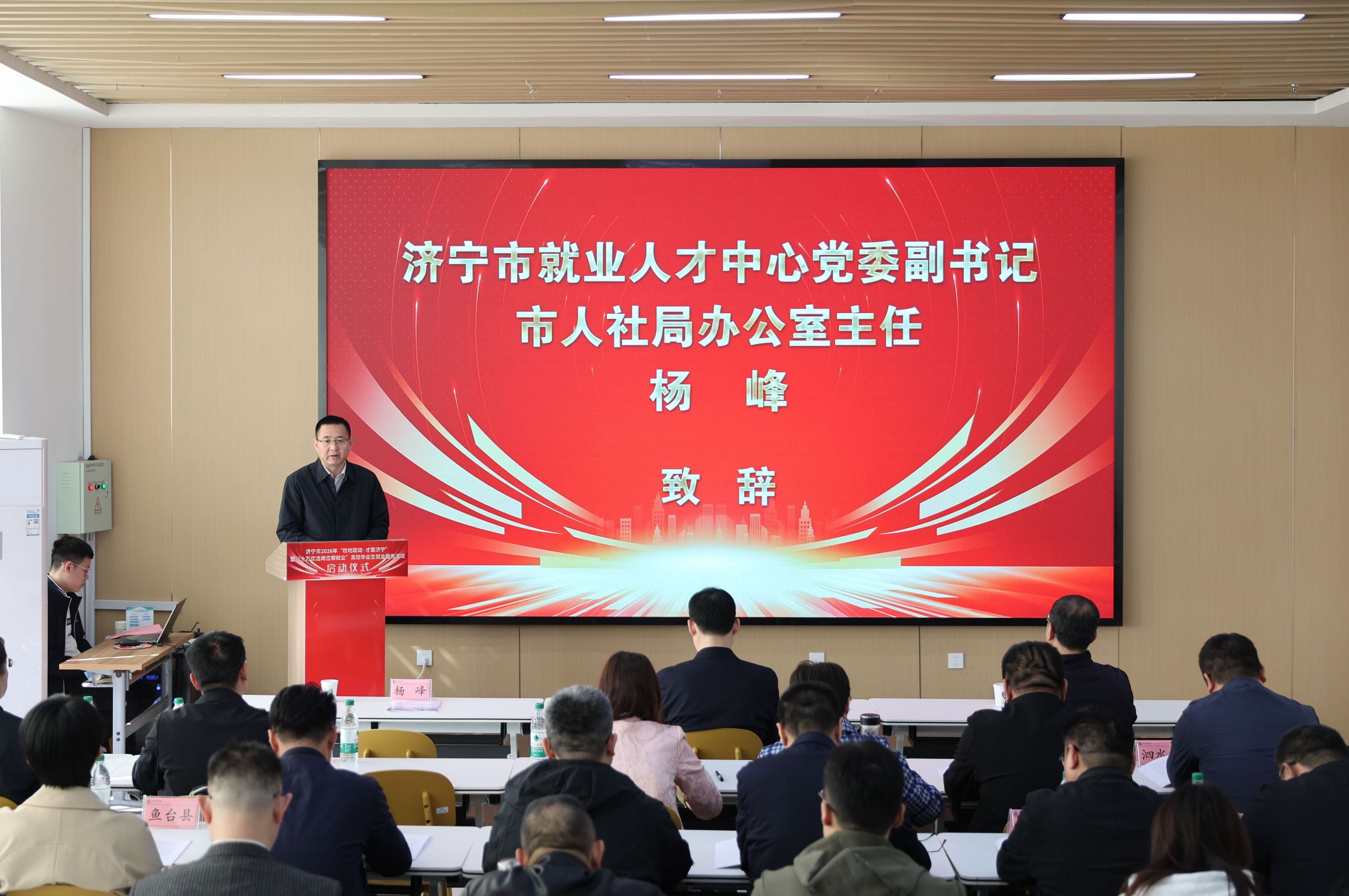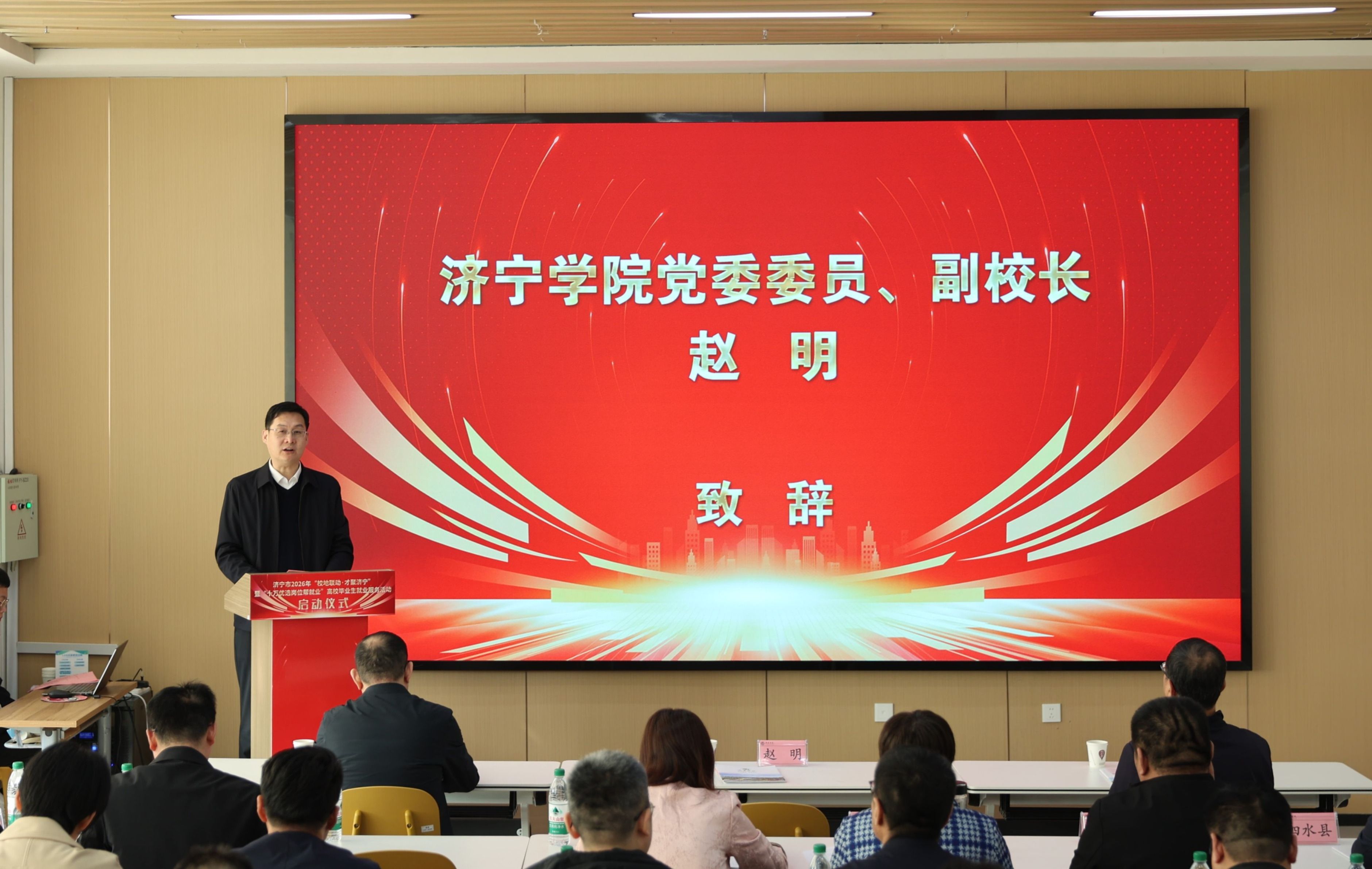 3月27日上午,由济宁学院、济宁市人力资源和社会保障局、济宁市总工会联合举办的2026年“校地联动・才聚济宁”高校毕业生就业服务活动启动仪式,在济宁学院大学生就业创业赋能中心隆重举办。济宁学院党委委员、副校长赵明,市就业人才中心党委副书记、市人社局办公室主任杨峰,市总工会三级调研员赵庆国等出席活动。各学院党委副书记、济宁市各县区人社部门负责人、师生企业代表参加仪式。济宁学院学生工作处处长张静主持仪式。