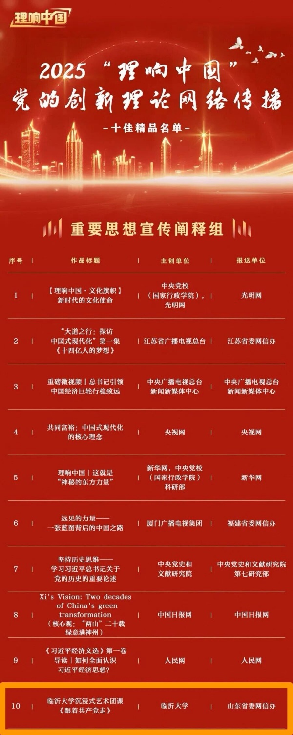 近日,由中央网信办、中央党校(国家行政学院)等多部门联合主办的2025年“理响中国”党的创新理论网络传播活动评选结果正式揭晓。由学校团委制作、传媒学院鲁晴老师指导的沉浸式艺术团课《跟着共产党走》,荣获“重要思想宣传阐释”类别“十佳精品项目”称号。