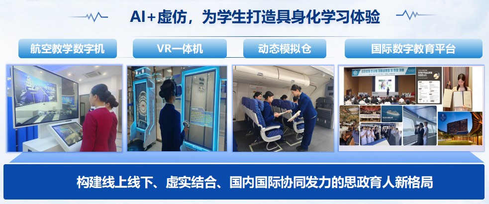 AI+虚仿,为学生打造具身化学习体验。学校以虚拟仿真、场景还原、数据建模技术为支撑,构建沉浸式、体验式实践教学场景。航空类专业依托虚拟仿真实训平台,将航空报国、安全责任、严谨敬业等行业素养融入模拟飞行、机务维修、客舱服务等实训环节;其他专业运用实景模拟、社会调查数据分析等工具,把工程伦理、社会责任、法治意识、人文素养等融入实验实训与专业见习。虚拟与现实相互支撑、线上与线下有机结合,让学生在“做中学”“练中悟”,切实提升思政教育的针对性与感染力。(图2)
