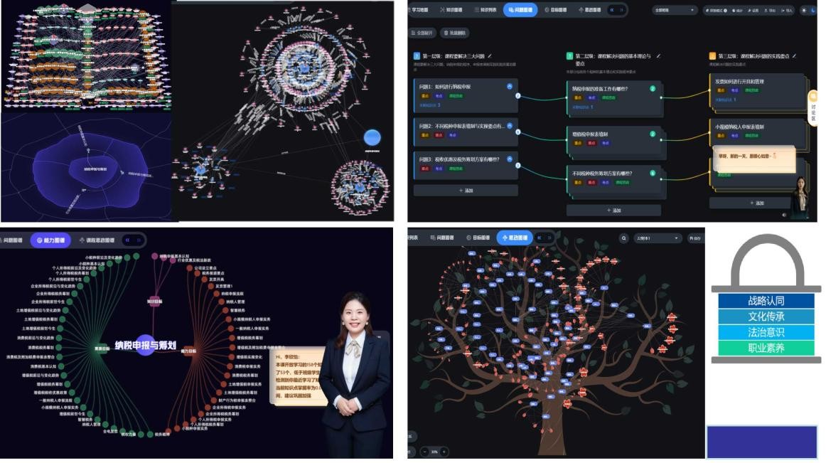 图谱导航,为学生规划智慧学习路径。学校依托智能教学平台,构建图谱化教学体系,运用知识图谱重构教学内容、问题图谱聚焦重点难点、能力图谱明晰进阶标准、思政图谱锚定价值导向,四大图谱协同发力,有效破解学生自主学习碎片化问题,助力系统化成长。平台整合资源精准推送、学情智能分析、课堂互动引导、教师数字人伴学等功能,推动思政元素与专业知识深度融合;教师依托数字资源库与智能备课工具,将家国情怀、职业精神、文化自信、生态理念自然融入教学,实现知识传授与价值引领同频共振。(图1)