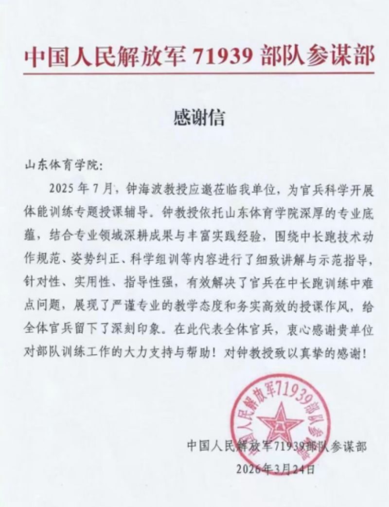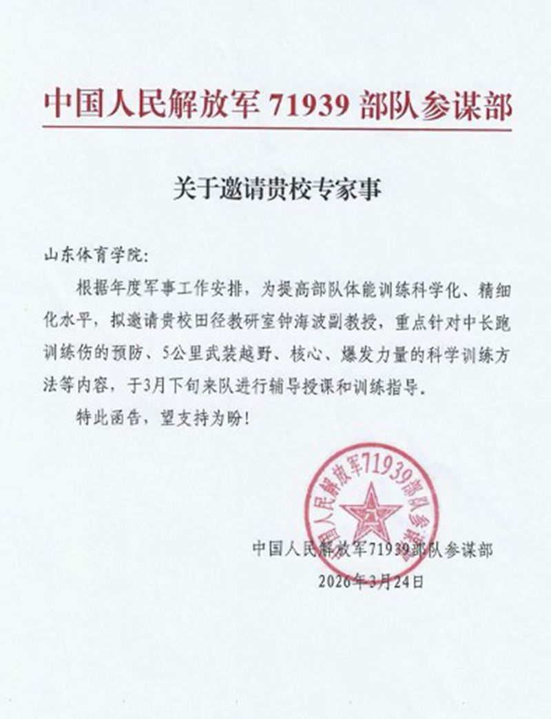2025年,钟海波曾受邀参与该部比武集训保障任务,为部队相关比武竞赛提供科学训练支持,助力多项体能课目成绩提升。活动结束后,部队专门致函山东体育学院,盛赞学校“以学科之长服务胜战之需”,是“智力拥军的标杆、军民融合的典范”。