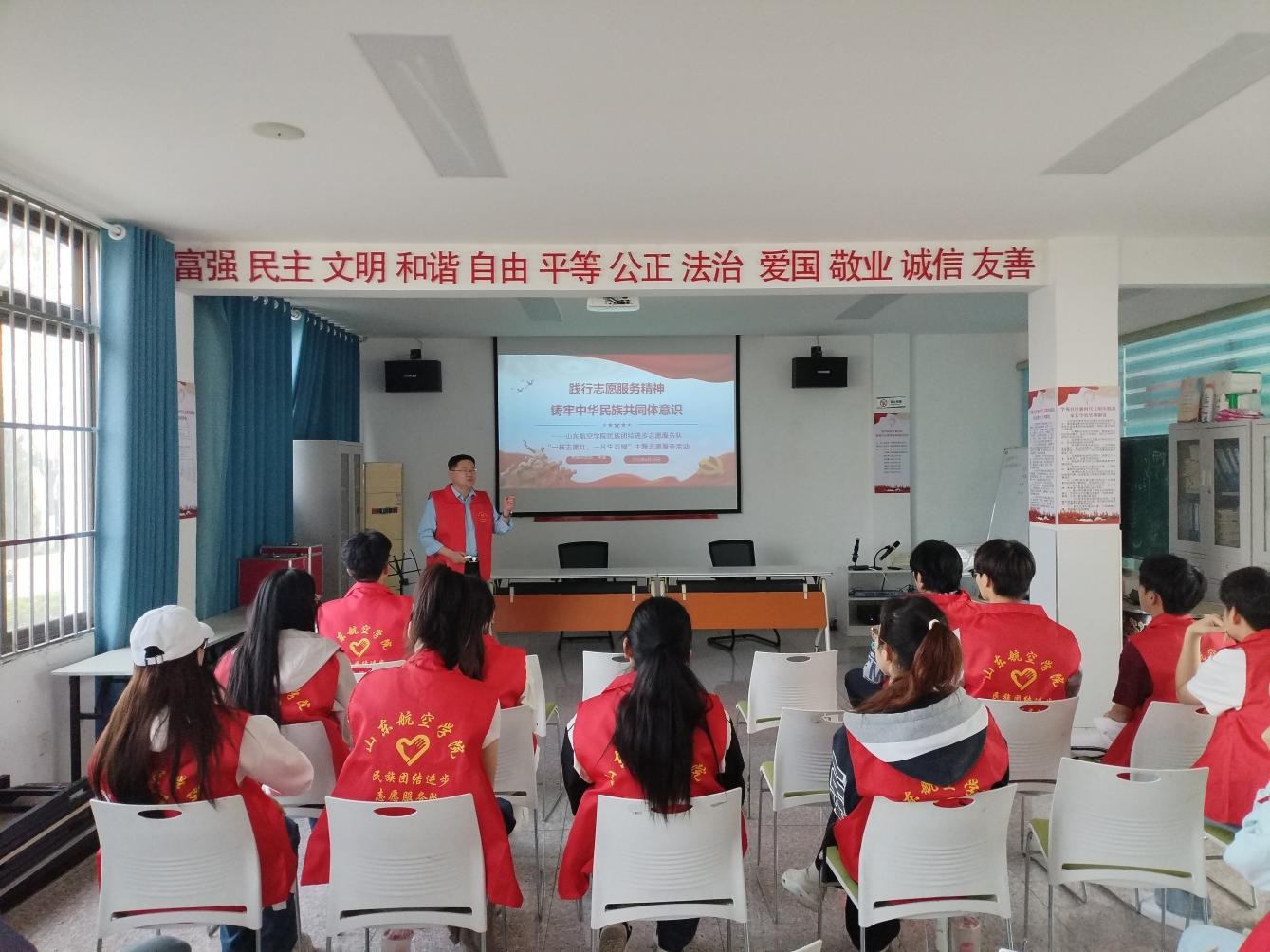 活动现场,山东省铸牢中华民族共同体意识宣讲团成员、山东航空学院党委统战部马金广老师紧扣铸牢中华民族共同体意识主线,结合专业宣讲经历,系统阐释新时代党的民族工作核心要义、实践要求,深入解读志愿服务队成立的初心使命与责任担当。讲解中,他深情讲述习近平总书记多次点赞的“三千孤儿入内蒙”同心佳话:上世纪六十年代,面对国家困难时期,内蒙古草原各族群众义无反顾接纳来自南方的孤儿,草原额吉用无私大爱抚育“国家的孩子”成长,谱写了一曲各民族手足相亲、守望相助的动人赞歌。这段跨越地域、超越血缘的温情历史,生动印证了中华民族休戚与共、荣辱与共、生死与共、命运与共的共同体理念。