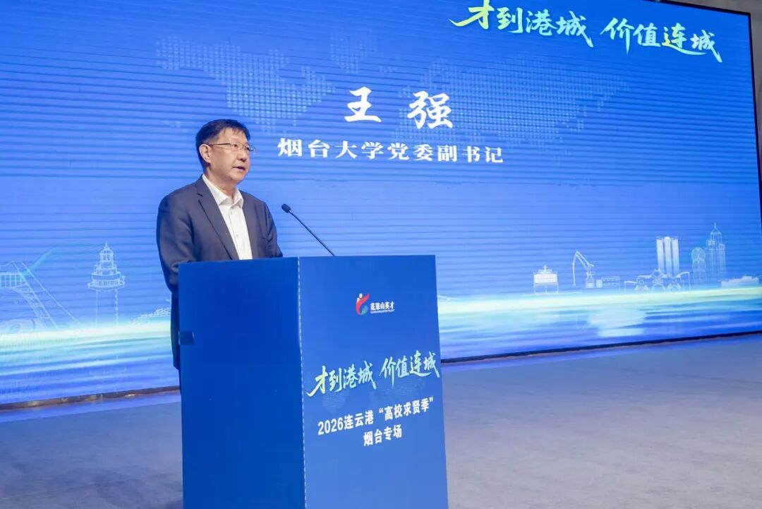 王强在致辞中介绍了烟台大学的历史沿革、办学特色和学科优势。他表示,烟台大学学科专业布局与连云港重点产业高度契合,校地合作潜力巨大,希望以此次活动为契机,持续深化校地产学研协同创新,在毕业生实习、就业等领域为青年学子搭建更广阔的成长舞台。