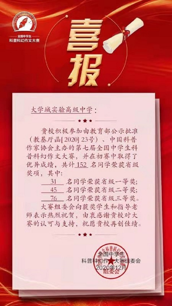 在中国科普作家协会主办的第七届全国中学生科普科幻作文大赛中,我校语文教研部按照大赛要求积极组织学生参加并取得优异成绩,共有152名同学获省级奖项,其中31名同学荣获省级一等奖,45名同学荣获省级二等奖,76名同学荣获省级三等奖。