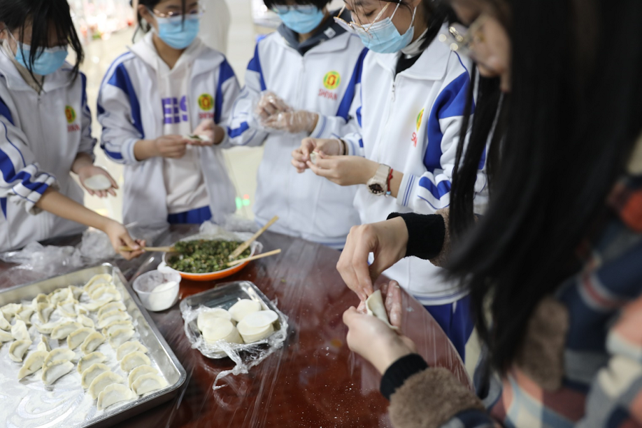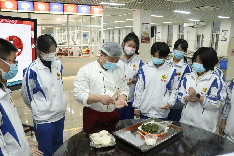 冬至到,吃水饺!冬至时节在我国北方有吃饺子的习俗。各班包饺子高手齐聚思源堂,经过“七步洗手法”之后,思源堂高级面点师现场教学水饺制作技艺——“如何包的皮儿薄馅足,如何包的又好又快”,同学们仔细聆听,用心操作。