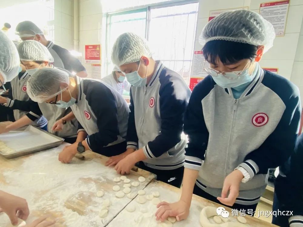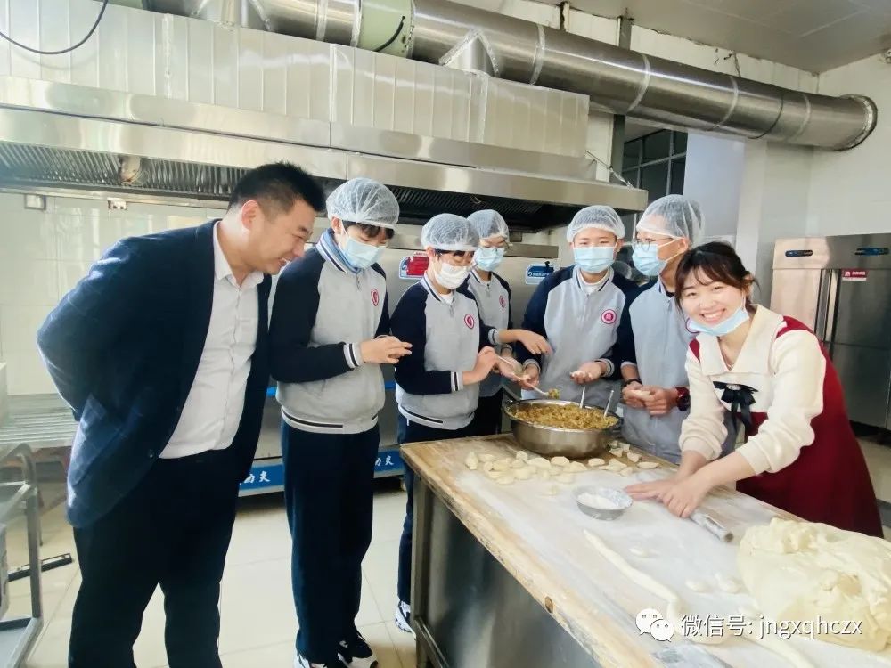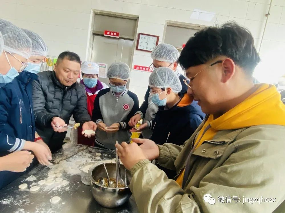 伴随下课铃响起, 被选中的同学快速冲出教室,兴高采烈的向餐厅跑去。餐厅卫生干净,工作人员早已准备好肉馅和面团,只见他们带好帽子、口罩,洗好手,在老师们的指导下积极兴奋地投入到了这项临时"工作”中。