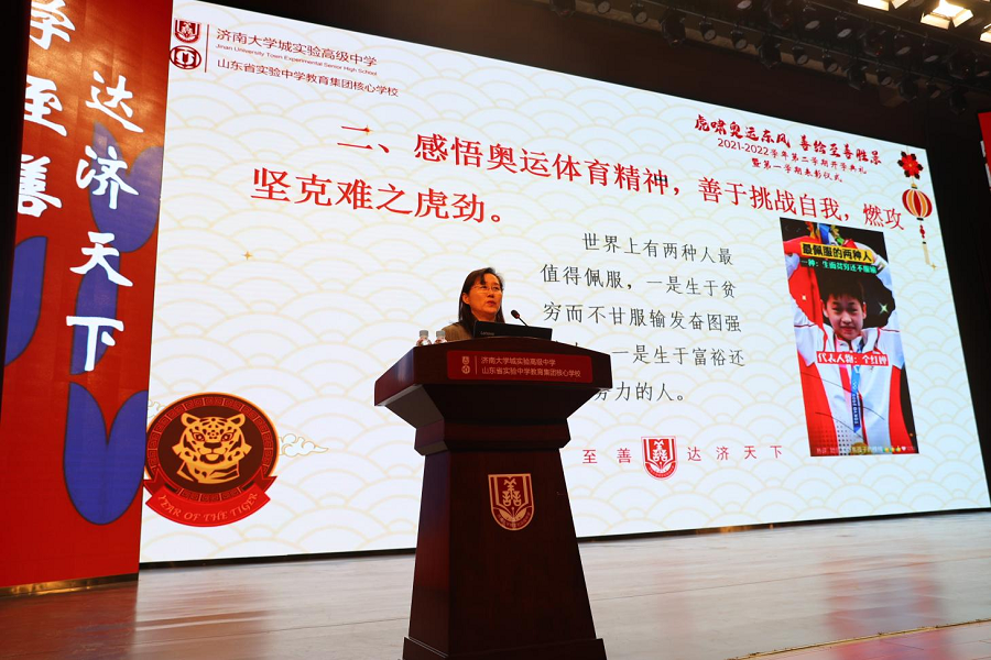 2月21日上午,济南大学城实验至善学子一起聆听党委书记、校长郑玉香带来的《乘虎势悟冬奥、拼坚韧追至善》新学期第一堂思政课。