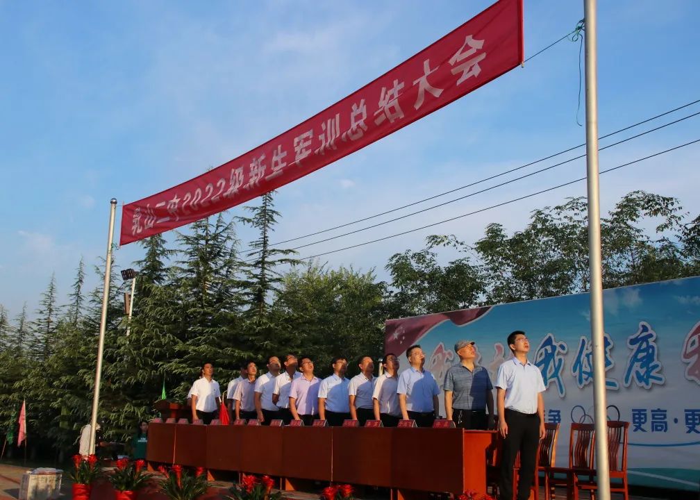 高一新生着装统一,整齐有序,精神饱满,激情澎湃。目光炯炯,驻足伫立,国歌唱响,师生面向缓缓上升的国旗伫立敬礼,传达着对祖国的崇高敬意。