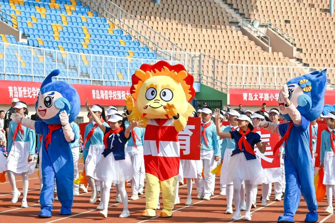 在雄壮的乐曲声中,由市南区中小学学生代表组成的40个方队整齐列队步入运动场。