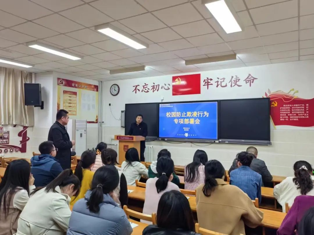 校长郑玉香主持召开校园欺凌防治工作专项部署会,在会上强调了预防校园欺凌工作的重要性,并结合学校实际,提出工作要求:一是关心、关爱每一名学生,二召开系列警示教育,三要家校合力,助力孩子正知、正向成长。