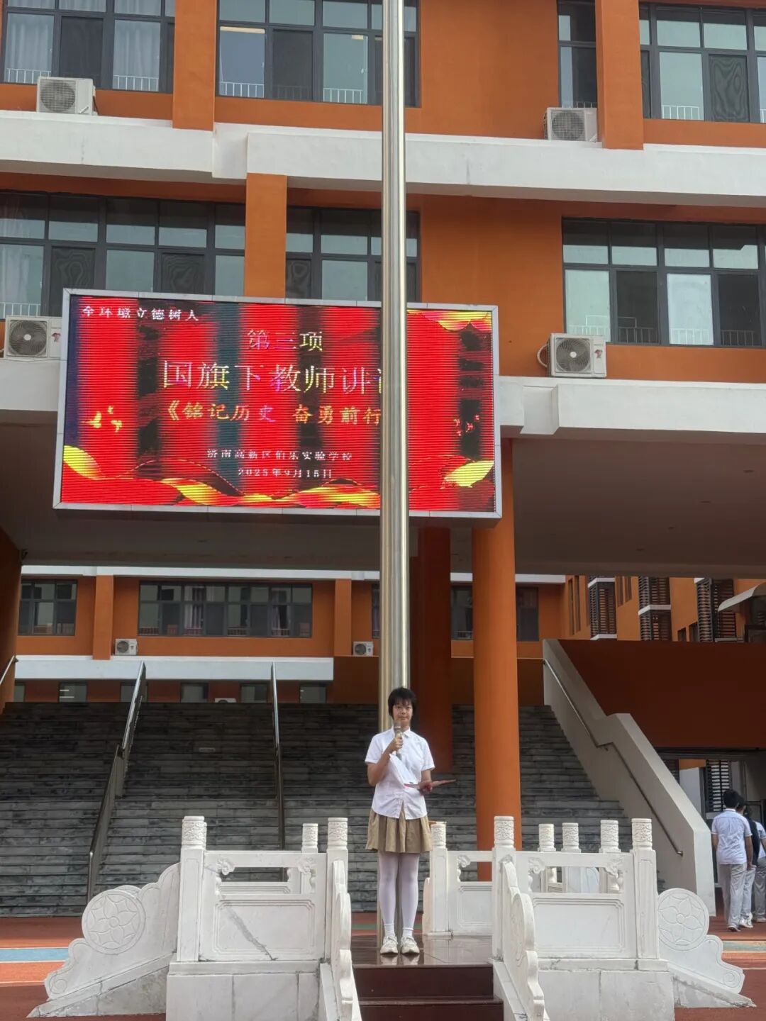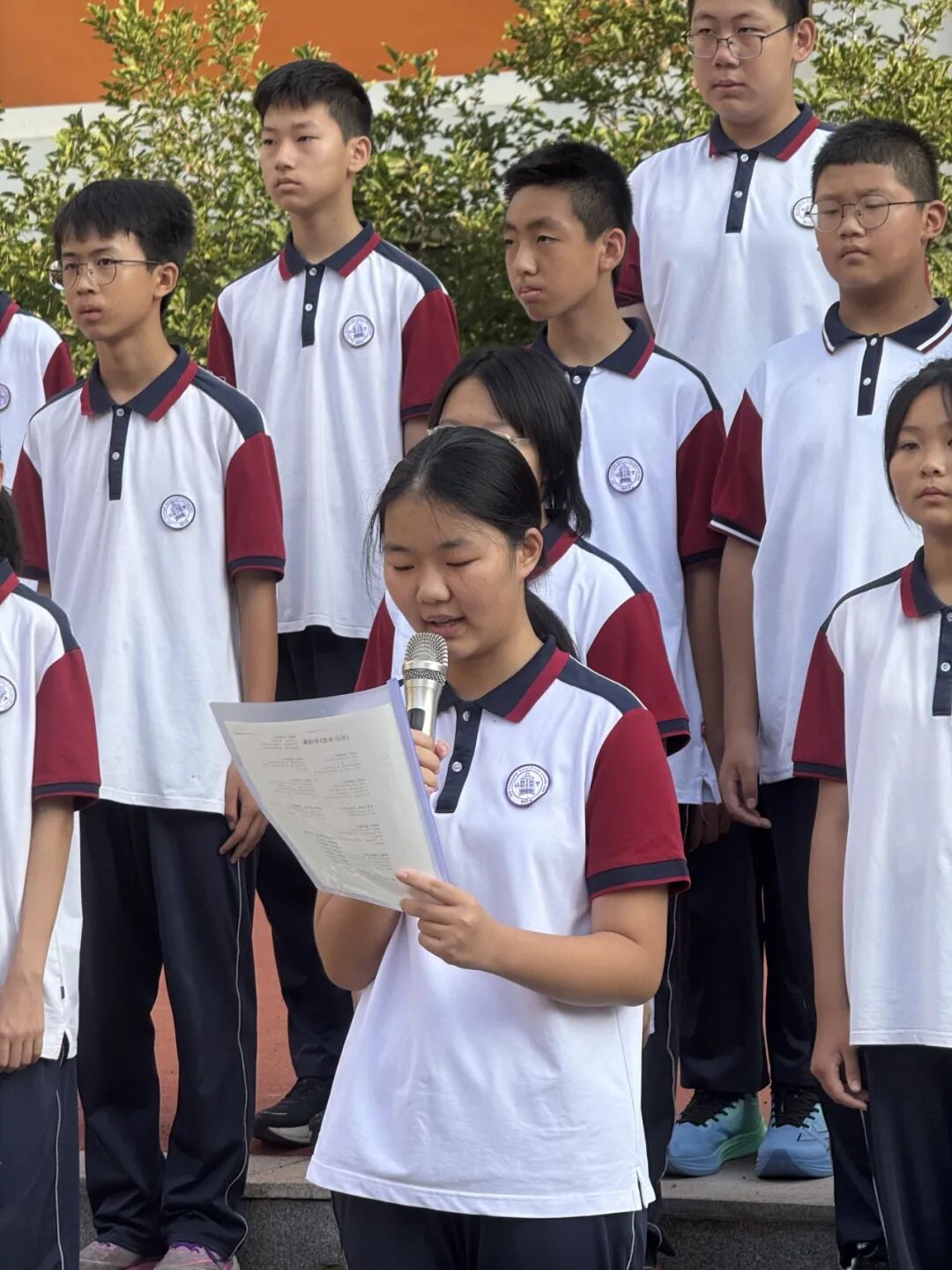 升旗礼毕,八年级(2)班学生代表裴梓萱同学发表了题为《勿忘国耻祭英魂,网安强国少年行》的国旗下讲话。她结合生活实际,生动地阐述了网络安全的重要性,从警惕网络诈骗、保护个人信息,到明辨网络谣言、拒绝网络暴力,向全体同学发出了“文明上网、安全用网”的倡议。