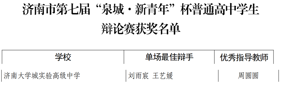 9月23日,济南市第七届 “泉城·新青年”杯普通高中学生辩论赛获奖名单正式公布,济南大学城实验高级中学 “暴雨辩论社” 的在校学子再度交出优异答卷:刘雨宸、王艺媛两位同学凭借清晰的逻辑、敏锐的反应和出色的表达,荣获 “单场最佳辩手” 称号;周圆圆老师被授予 “优秀指导教师” 荣誉。